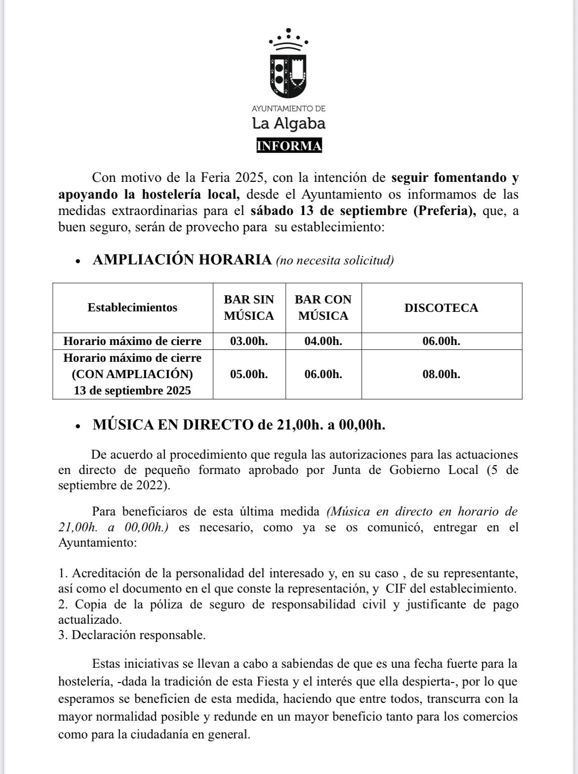 Con la intención de seguir fomentando y apoyando la hostelería local, desde el Ayuntamiento informamos de las medidas extraordinarias para el sábado 13 de septiembre (preferia).
