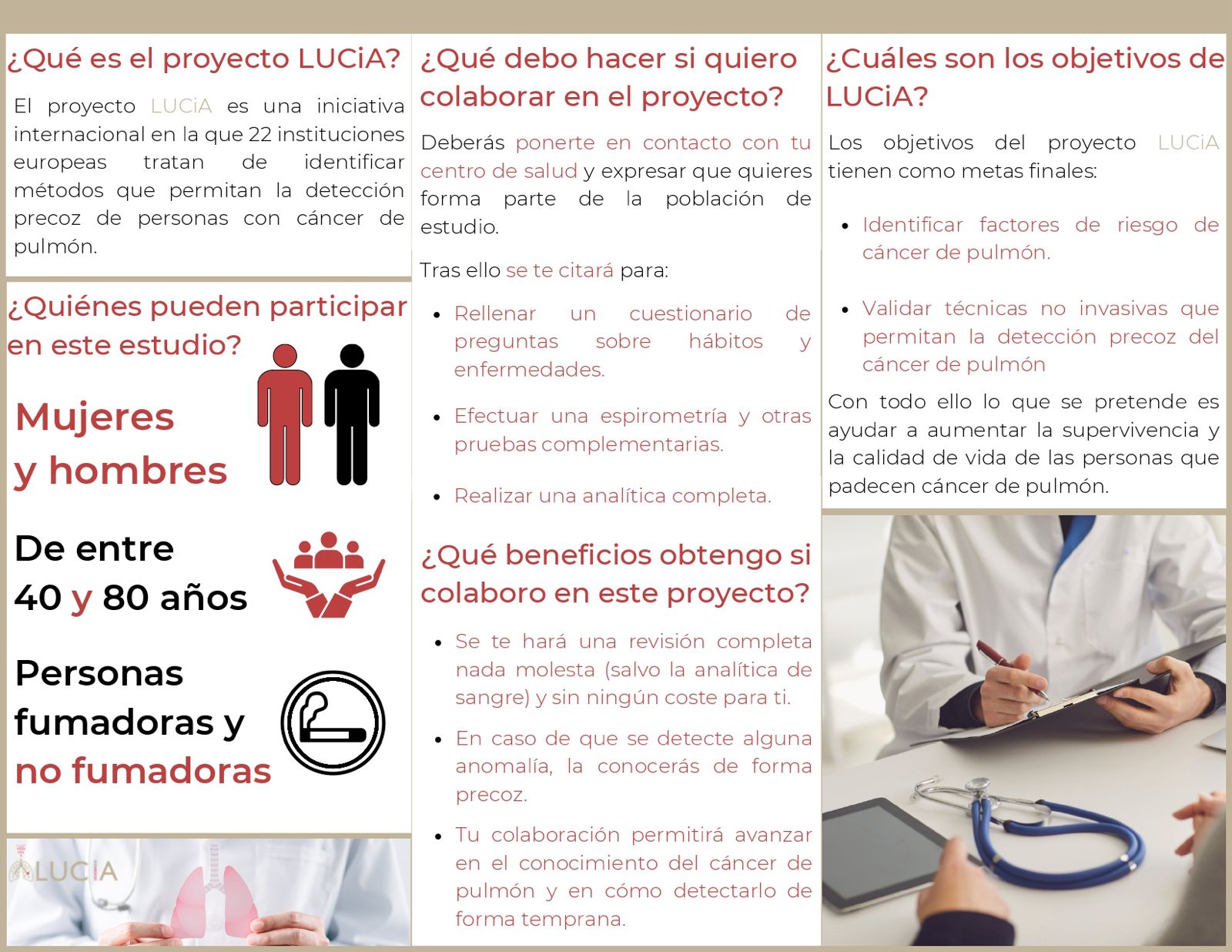 El proyecto LUCÍA es una iniciativa internacional y en él pueden participar mujeres y hombres de entre 40 y 80 años, fumadoras o no.