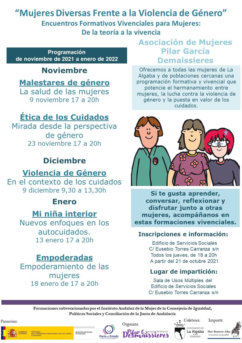 Esta acción formativa está subvencionada por el Instituto Andaluz a la Mujer a la asociación de mujeres Pilar García Desmaissiéres, decana dentro del movimiento asociativo femenino local, en la convocatoria de subvenciones a asociaciones y federaciones de mujeres para la realización de proyectos que fomenten la erradicación de la violencia de género.