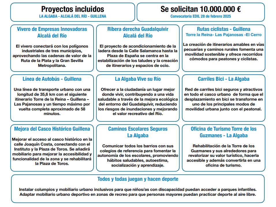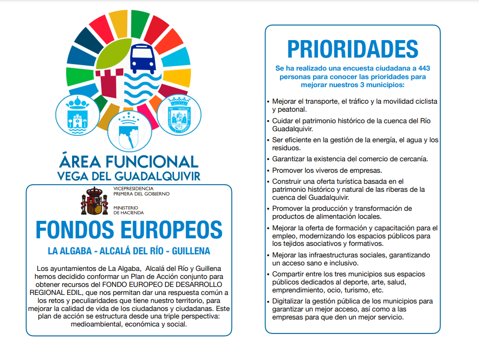 Los ayuntamientos de La Algaba, Alcalá del Río y Guillena hemos decidido conformar un Plan de Acción conjunto para obtener recursos del FONDO EUROPEO DE DESARROLLO REGIONAL, que nos permitan dar una respuesta común a los retos y peculiaridades que tiene nuestro territorio, para mejorar la calidad de vida de los ciudadanos y ciudadanas. Este plan de acción se estructura desde una triple perspectiva: medioambiental, económica y social.