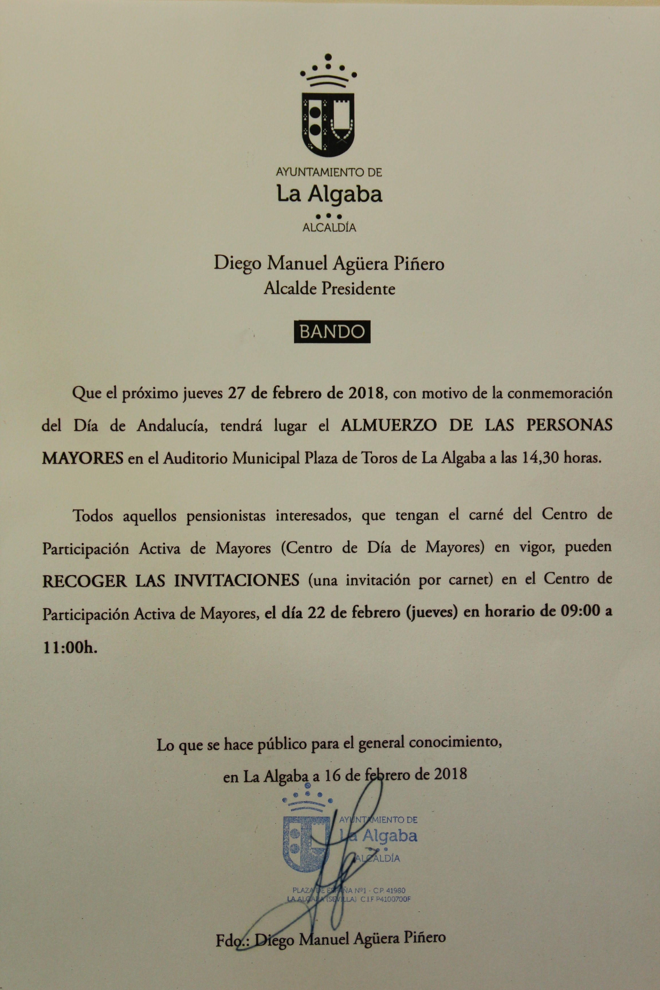 BANDO: Almuerzo de mayores por el Día de Andalucía