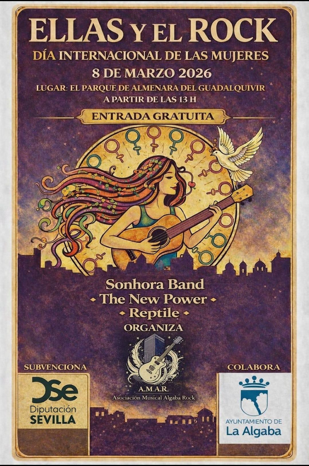 A continuación, tendrá lugar el concierto “Ellas y el Rock”, organizado por la asociación local ALGAROCK, poniendo música y reivindicación a esta jornada tan significativa.