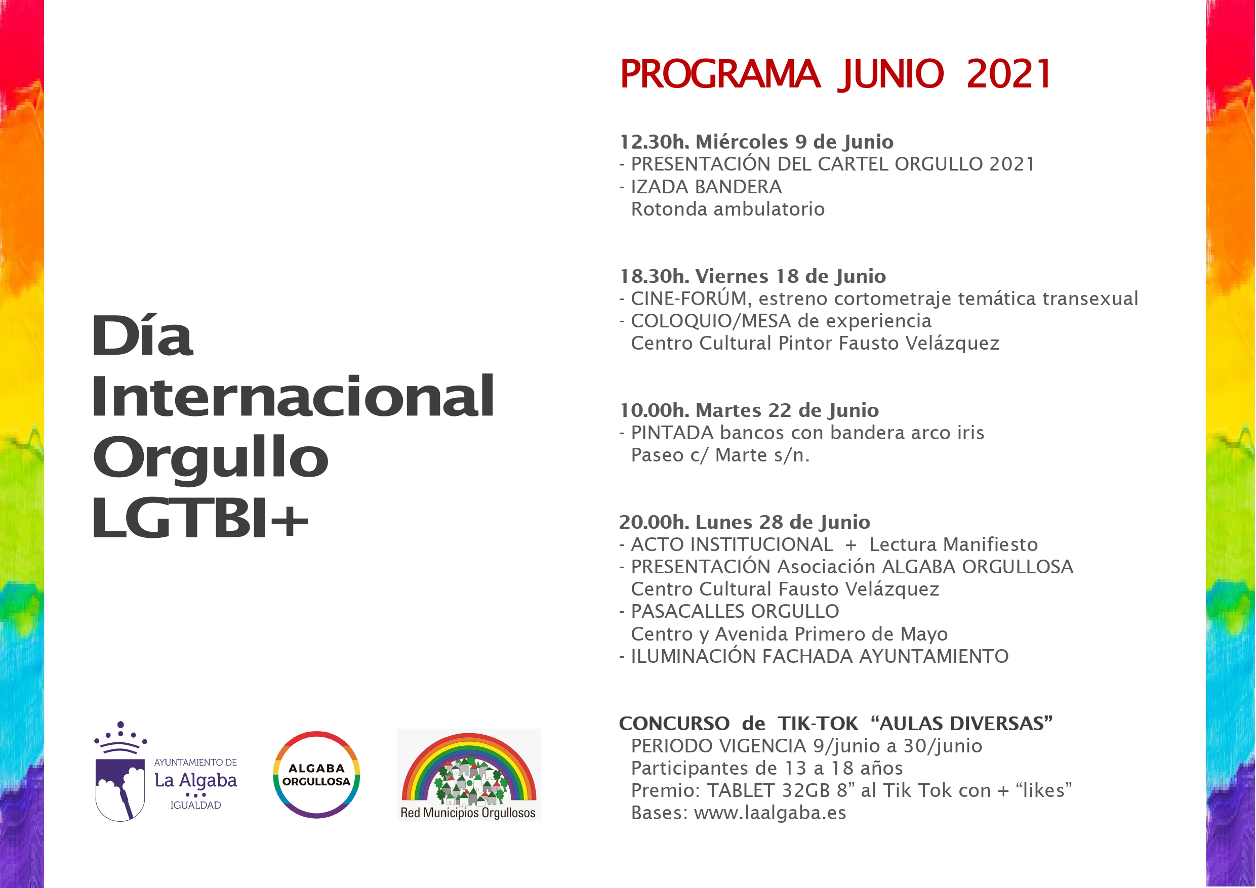El Ayuntamiento de La Algaba presenta el programa 'JUNIO POR LA DIVERSIDAD', que incluye actividades culturales, artísticas, reivindicativas y de concienciación y que es fruto de la colaboración de la Delegación de Políticas de Género y Diversidad, la Asociación Algaba Orgullosa y la Red de Municipios Orgullosos.
