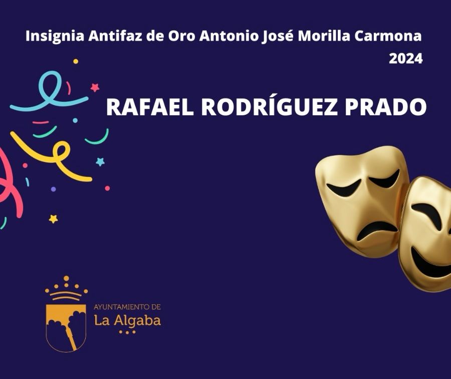El Antifaz de Oro 2024 ha sido concedido a RAFAEL RODRÍGUEZ PRADO por su trayectoria y colaboración con el carnaval algabeño, además de por expresar con orgullo su sentimiento carnavalesco y su sentir como algabeño. Un galardón que se aprobará en el próximo pleno municipal previsto para final de este mes de enero.