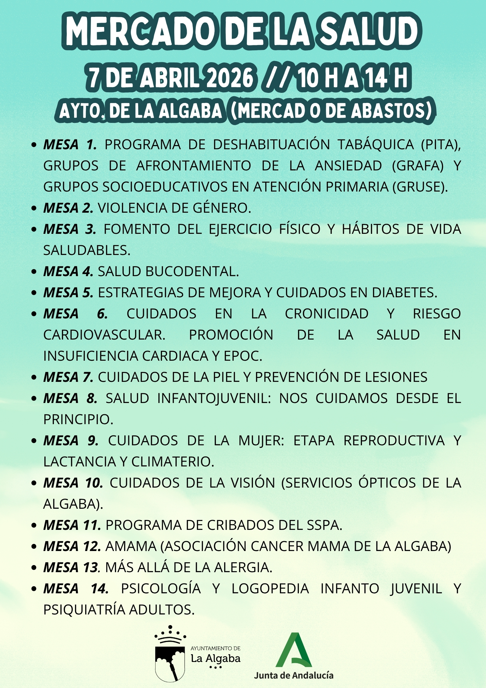 Posteriormente, de 10:00 a 14:00 horas, se celebrará el “II Mercado de la Salud” en el Ayuntamiento (Mercado de Abastos), donde se instalarán diferentes mesas informativas atendidas por profesionales sanitarios. En ellas se abordarán temas de gran interés como la deshabituación tabáquica, la salud mental, la actividad física, la salud bucodental, la diabetes, la prevención cardiovascular, los cuidados de la piel, la salud infantil, la salud de la mujer, la visión, los programas de cribado, el cáncer de mama, las alergias y la atención psicológica y logopédica.