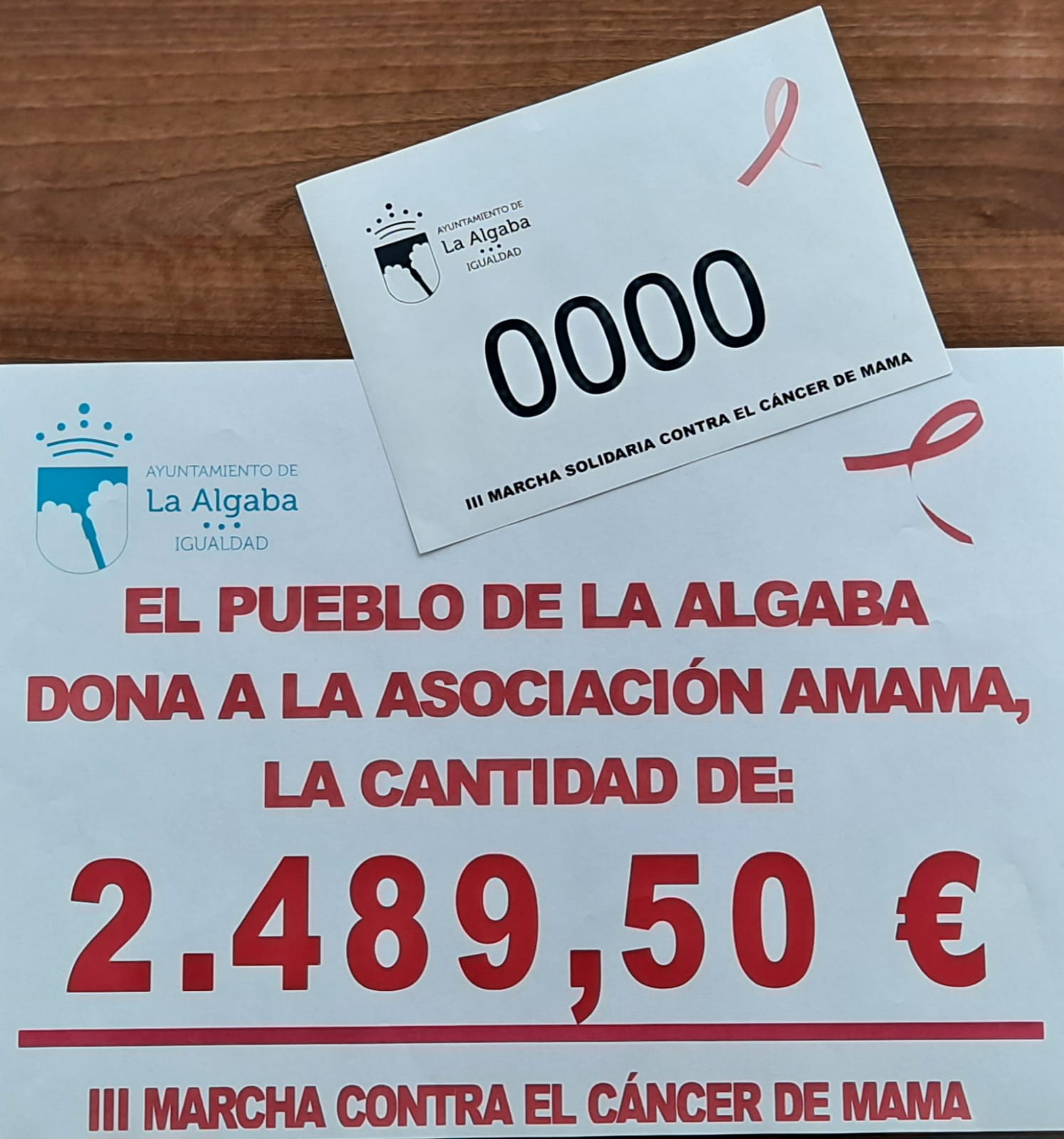 718 participantes en la III Marcha Solidaria contra el cáncer de mama han hecho posible que el Ayuntamiento de La Algaba entregue a la Asociación de mujeres con cáncer de mama (AMAMA) la cantidad de 2.489,50 euros para la investigación.