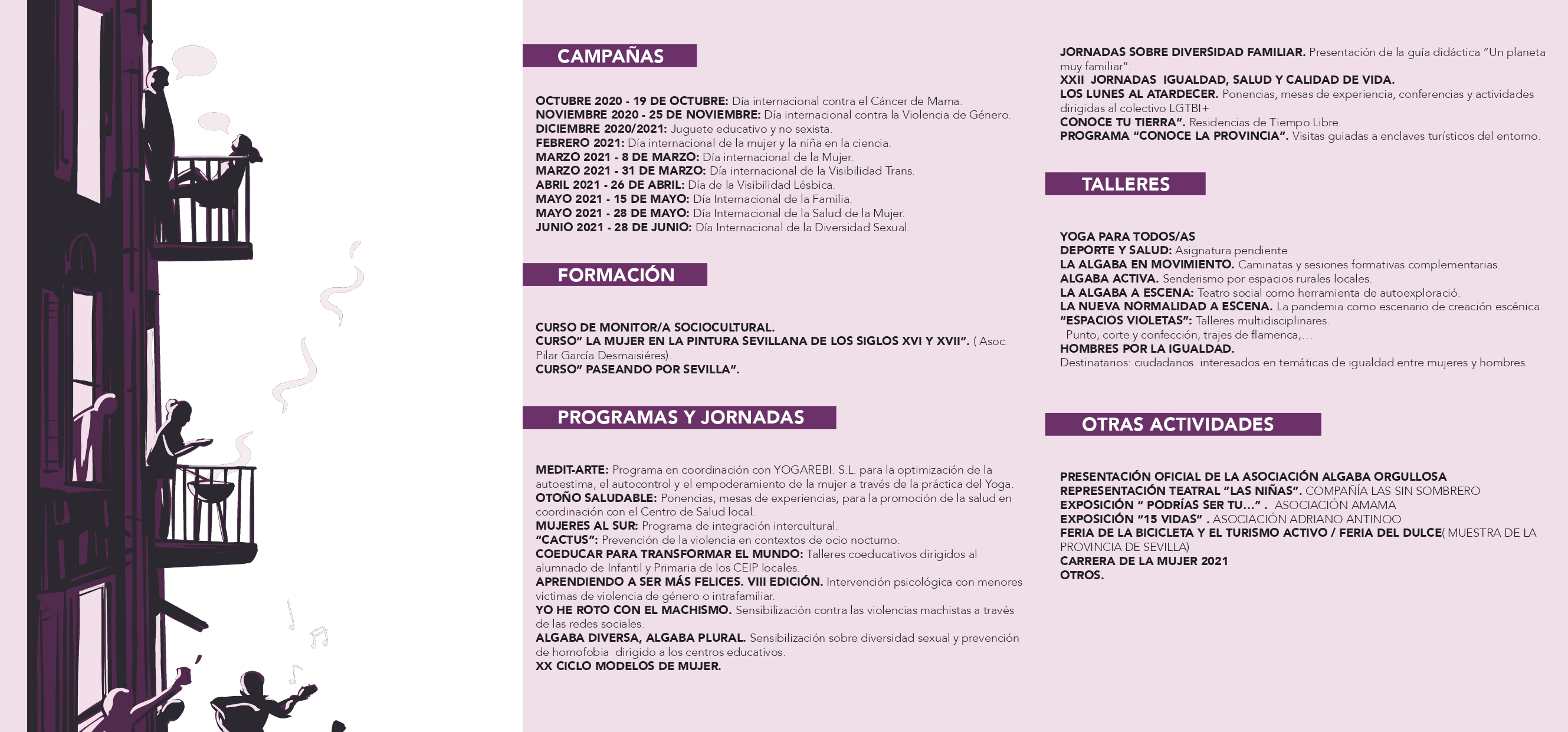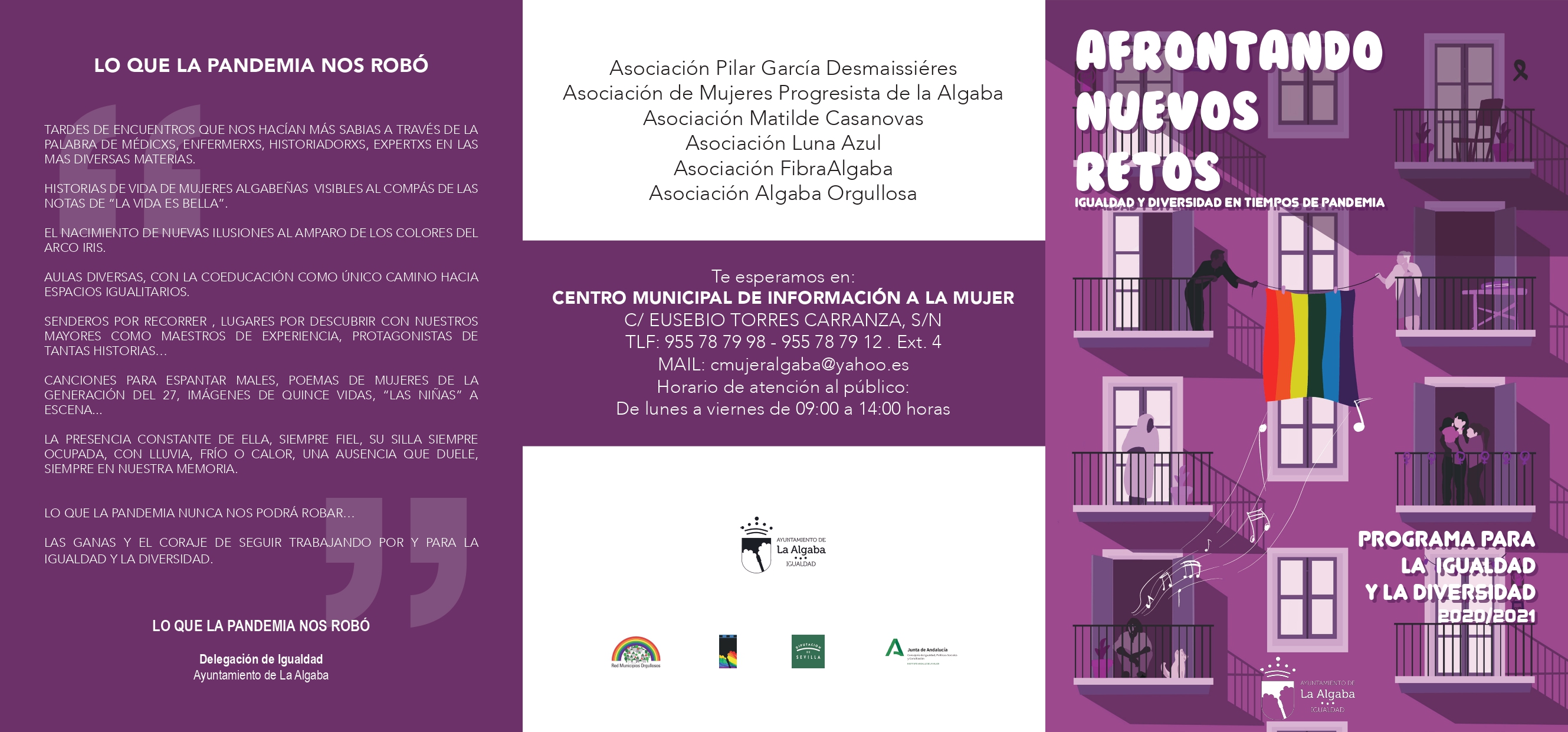 El Ayuntamiento de La Algaba, a través de la Delegación de Igualdad y Políticas de Género, ha presentado el programa de Igualdad y Diversidad 2020/2021 para reforzar el compromiso del municipio con la diversidad. Para ello, en colaboración con entidades y asociaciones, se pondrán en marcha proyectos de sensibilización, jornadas de formación, talleres y otras actividades.