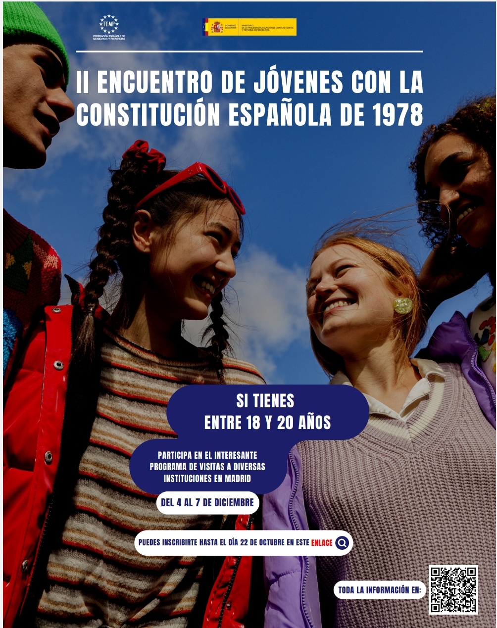 Conscientes de la importancia de que los y las jóvenes perciban la Constitución como algo cercano, como una herramienta útil que les representa, la Secretaria de Estado de Relaciones con las Cortes y Asuntos Constitucionales (Ministerio de la Presidencia, Relaciones con Las Cortes y Memoria Democrática) y el Centro de Estudios Políticos y Constitucionales (CEPC), con la colaboración de la Federación Española de Municipios y Provincias (FEMP), acordaron realizar un programa formativo sobre la Constitución Española de 1978, que este año tendrá lugar entre los días 4 al 7 de diciembre de 2023. En el mismo están llamados a participar jóvenes de entre 18 y 20 años, mujeres y hombres procedentes de todas las Comunidades Autónomas, tanto del medio rural como del urbano y con perfiles diversos.