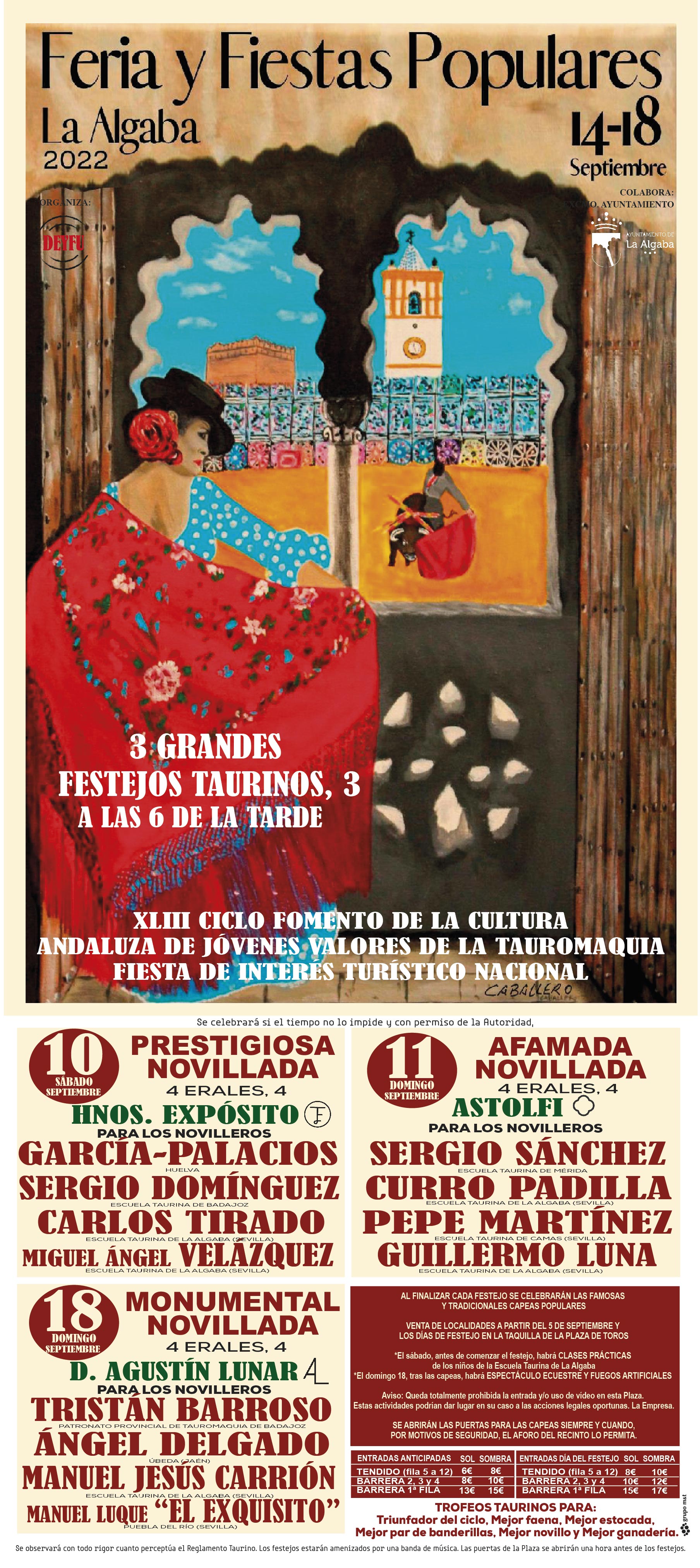 Las reses que se lidiarán en la XLIII edición taurina serán erales. Además, habrá tradicional suelta de vaquillas después de cada festejo. Un ciclo para el que se contará con doce aspirantes, tanto locales como provinciales y de otros lugares de la geografía taurina española; entre ellos, el ganador del XXXV Ciclo de Promoción de Sevilla y alumno de la escuela taurina algabeña, Manuel Jesús Carrión.