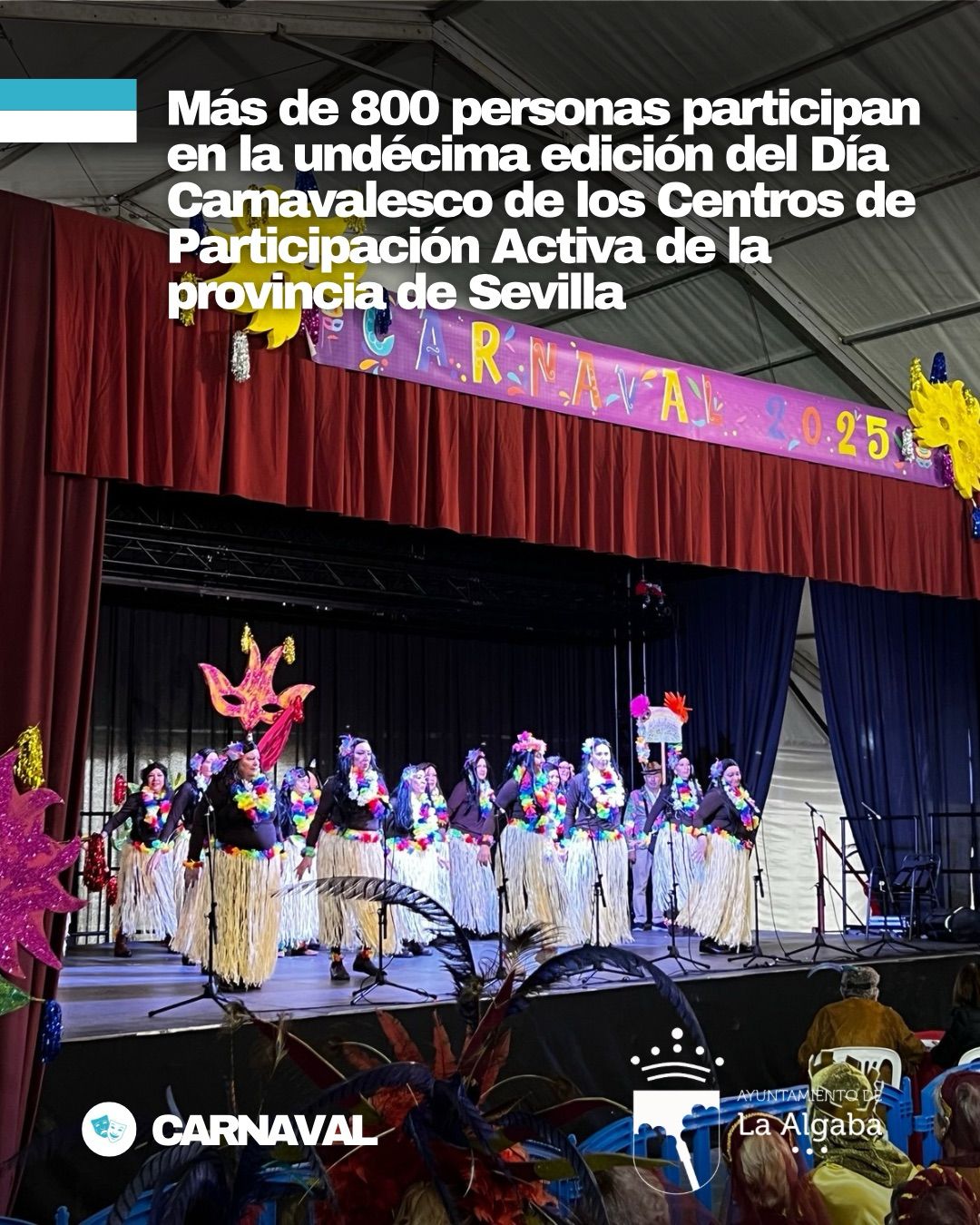 La Algaba ha acogido hoy, por décimo primer año, el Día Carnavalesco de los Centros de Participación Activa de la provincia de Sevilla. Un evento ya consolidado que se celebra en el Auditorio Municipal del municipio y que ha contado con la participación de más de 800 personas mayores.
