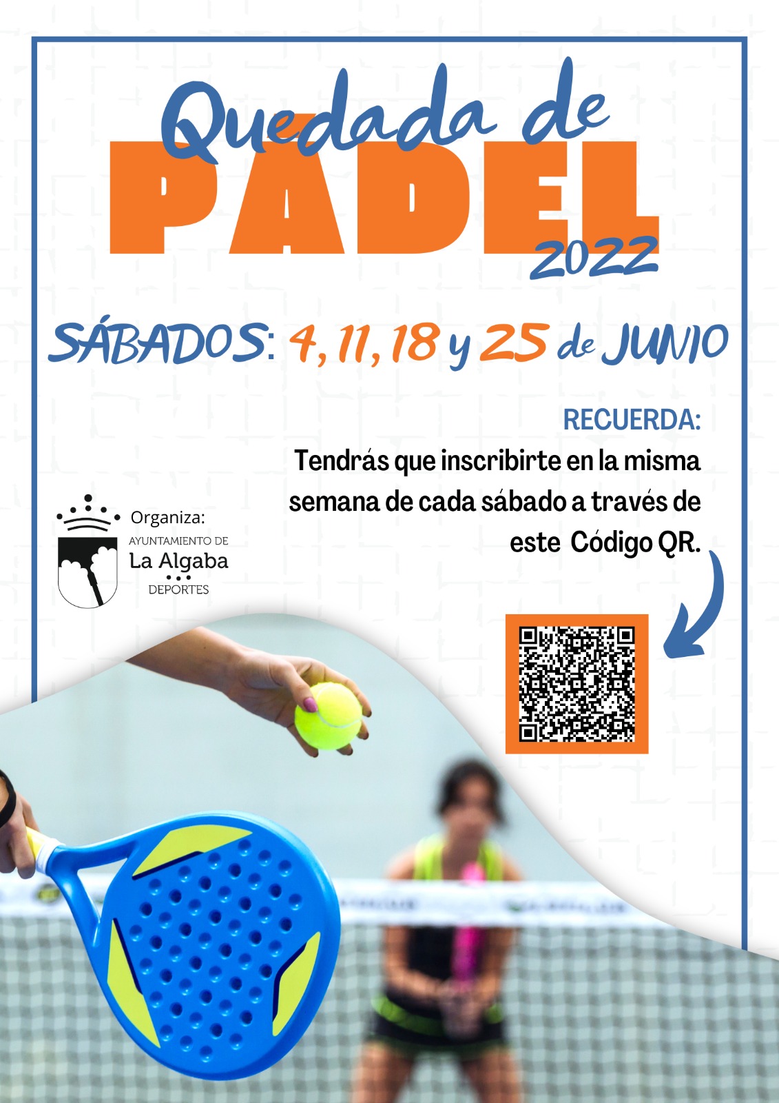 Los sábado del mes de junio se celebrarán quedadas de pádel para disfrutar del deporte y el ocio. Para ello, debes inscribirte a través del QR del cartel la misma semana de la actividad (desde las 9:00 horas hasta las 14:00 del viernes de la semana).