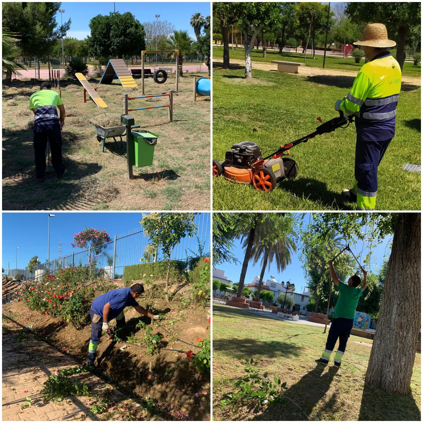 El Ayuntamiento de La Algaba está trabajando para poner a punto los parques y jardines de la localidad para su reapertura tras el estado de alarma llevando a cabo labores de refuerzo en la limpieza, jardinería, abonado de césped y zonas verdes, desinfección del mobiliario urbano y tratamientos de desinsectación para la prevención de plagas de insectos.