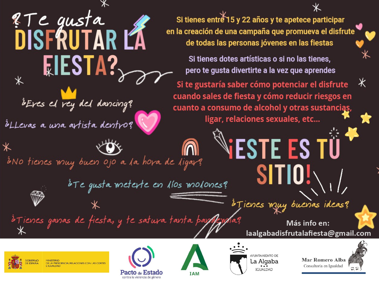 El Ayuntamiento de La Algaba, a través de la Concejalía de Políticas de Género y Diversidad y la profesional Mar Romero, pone en marcha el proyecto participativo ¿Te gusta disfrutar de la Fiesta?, destinado a la población joven:
