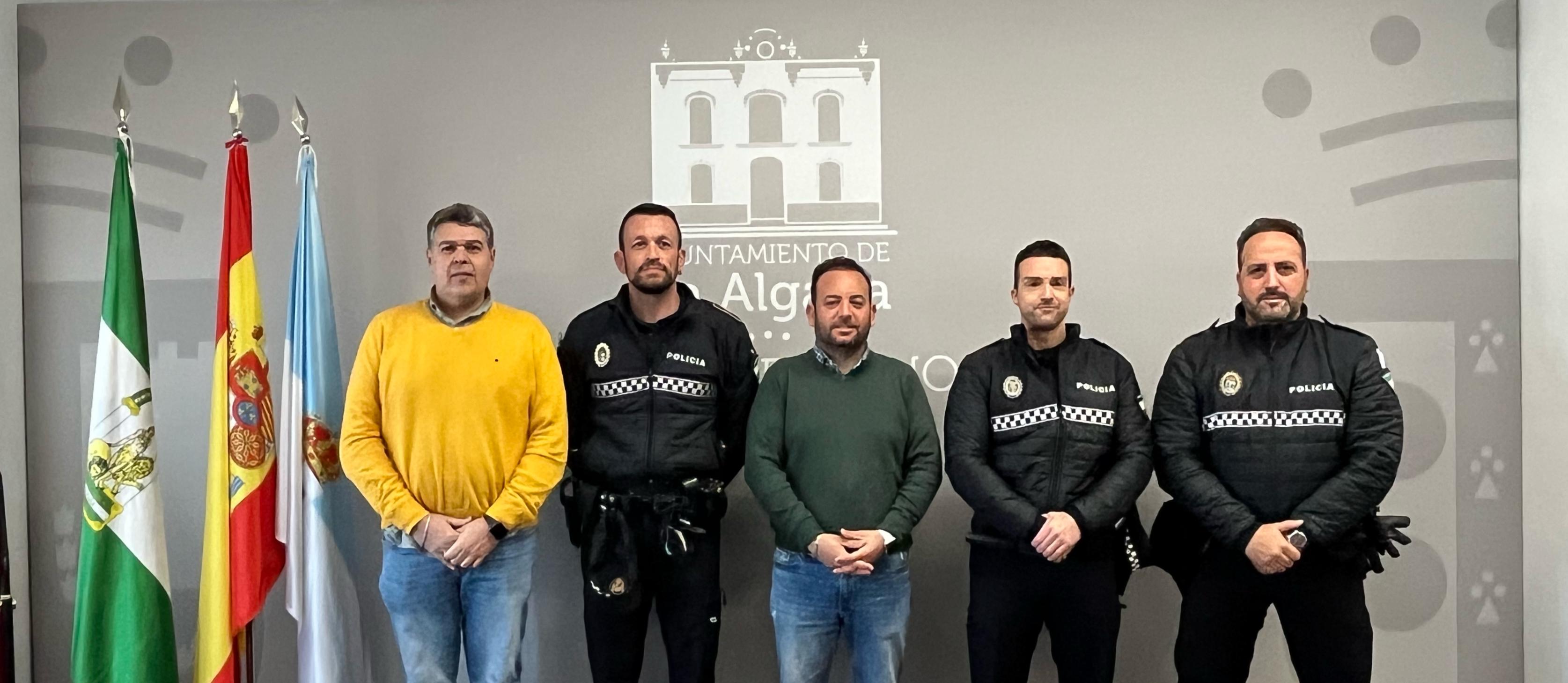 Los agentes junto al Jefe de la Policía Local, Alcalde, Diego Manuel Agüera Piñero y concejal de Seguridad ciudadana, Francisco M. Amores.